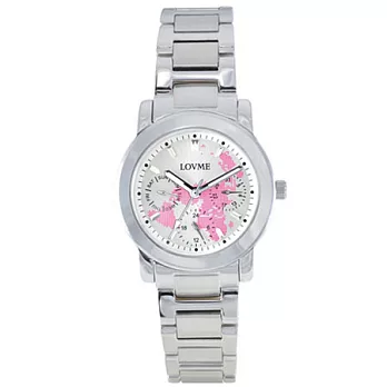 《LOVME》世界戀情系列-都會世界地圖三眼時尚錶(銀粉色)